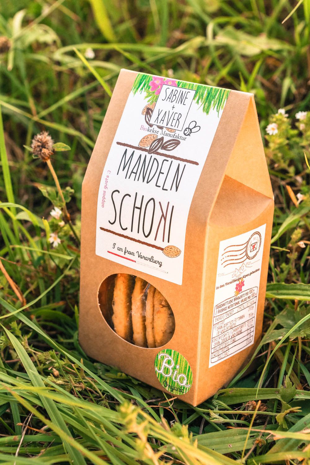 Bio Zutaten: Dinkelmehl, Ländle Butter (Milch), Rohrzucker, Schokolade (Kakaomasse, Kakaobutter, Zucker, Emulgator: Sojalecithin), Kartoffelstärke, Ländle Eier, Ländle Milch, und eine Prise Salz.