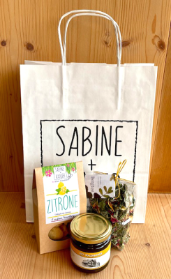 ein Glas Waldhonig aus dem Bregenzerwald (Bio zertifiziert, 250 Gr.) sowie aromatischer Bergtee mit Kräutern aus dem Biosphärenpark Großes Walsertal (20 Gr.).