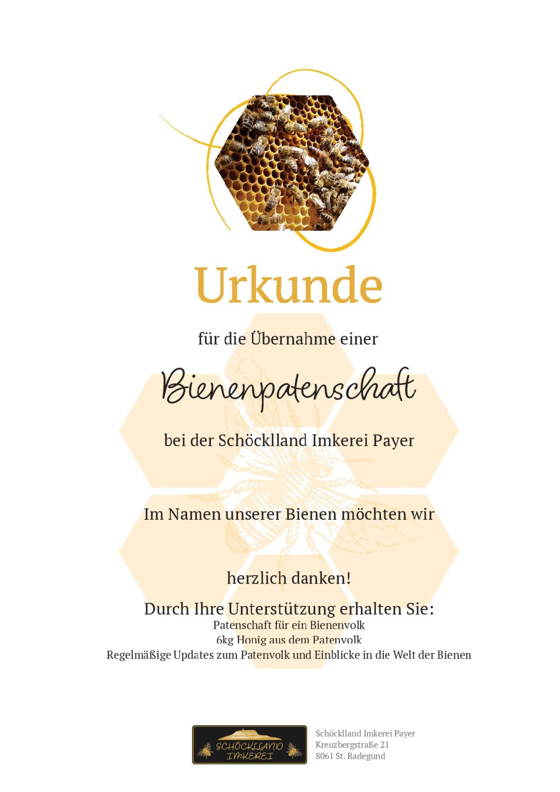 Als Pate erhalten Sie 6 kg exklusiven Honig, der von Ihrem eigenen Bienenvolk gesammelt wurde. Dieser naturbelassene Honig ist nicht nur besonders lecker, sondern auch ein ganz persönlicher Genuss – direkt von "Ihren" Bienen produziert! Sie können ihn pur genießen, als Geschenk weitergeben oder ihn in Ihrer Küche kreativ einsetzen.