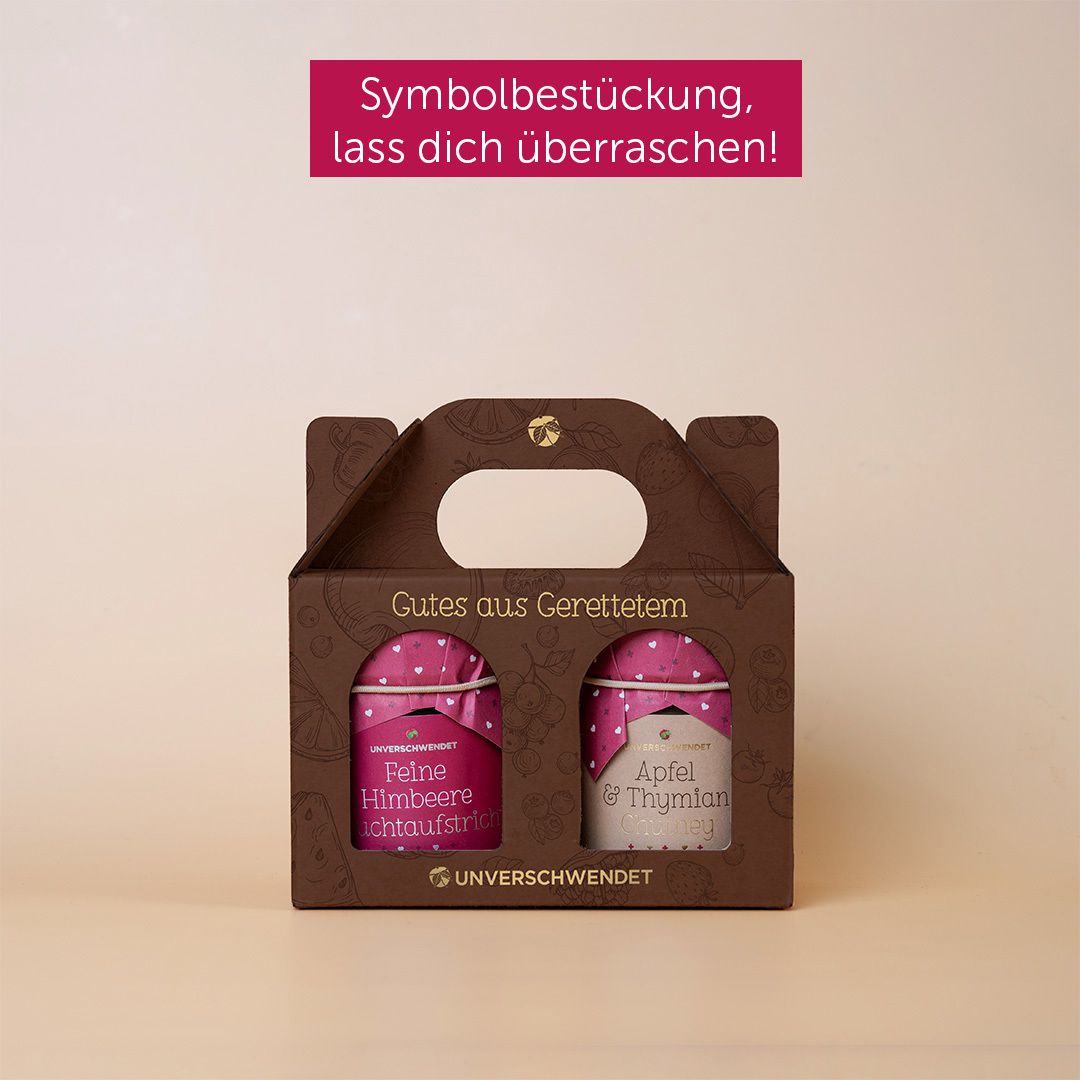 Lass dich überraschen - ein süßes und ein pikantes Feinkostglas im edlen Karton