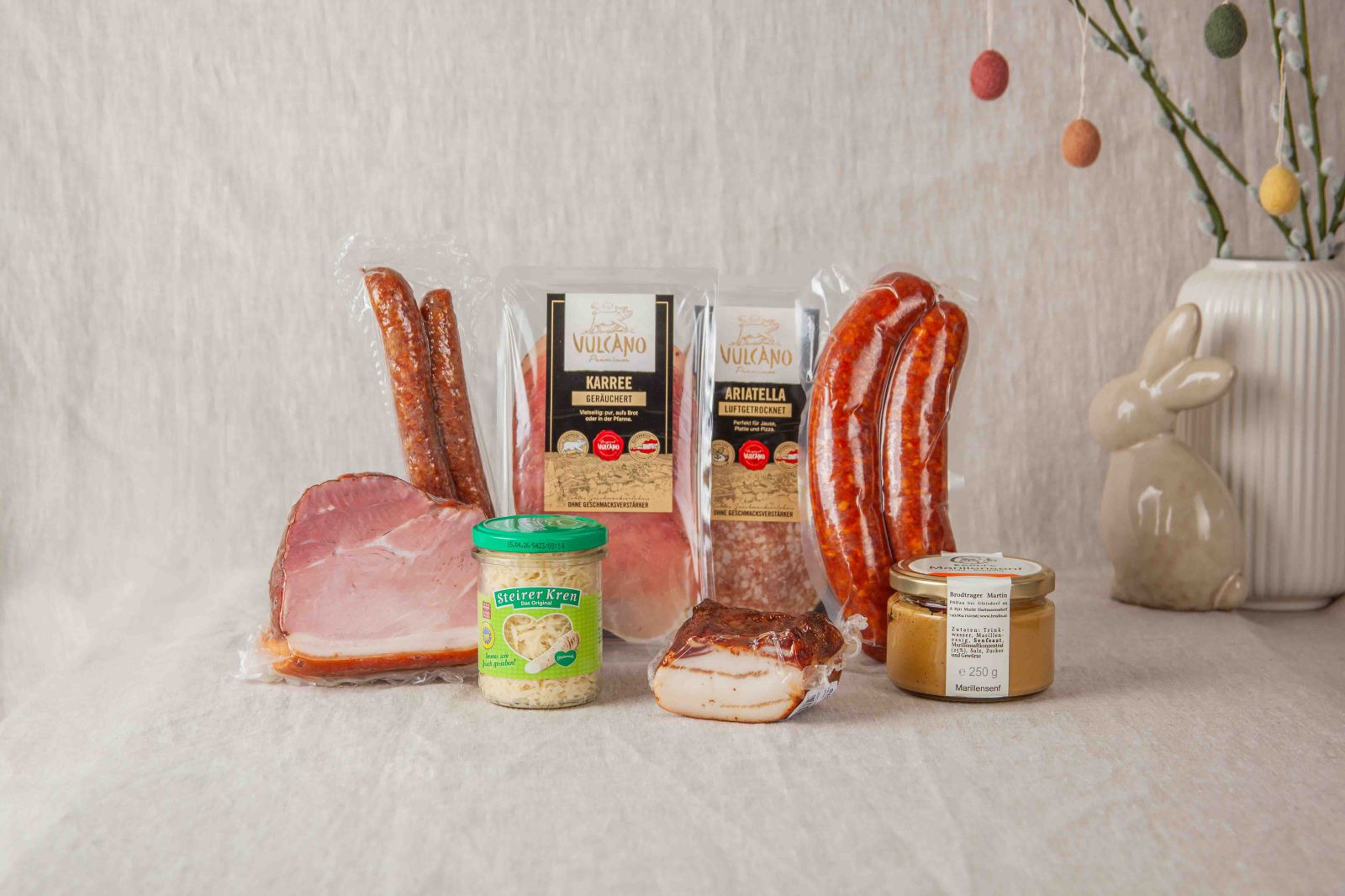 Liebevoll zusammengestellt findest du in diesem Paket die Must-Haves für den Ostertisch. Diese Auswahl vereint beliebte Vulcano Klassiker mit steirischem Kren und fruchtig-mildem Marillensenf. Ob als herzhaftes Frühstück, gemütliche Nachmittagsjause oder Ostertisch-Highlight – dieses Paket bringt den Geschmack der steirischen Genussmanufaktur direkt zu dir nach Hause.