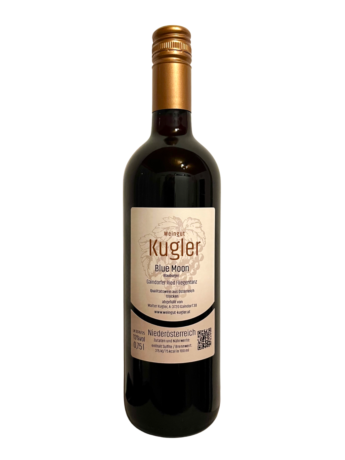 Wurde nachts bei Mondschein gelesen, daher "Blue" von Blauburger und "Moon" von Mondschein. Ein sehr trinkfreudiger leichter Wein. Leicht, weil wenig Tannine, Duft nach Veilchen und samtig. Kann auch leicht gekühlt getrunken werden. Trocken ausgebaut.