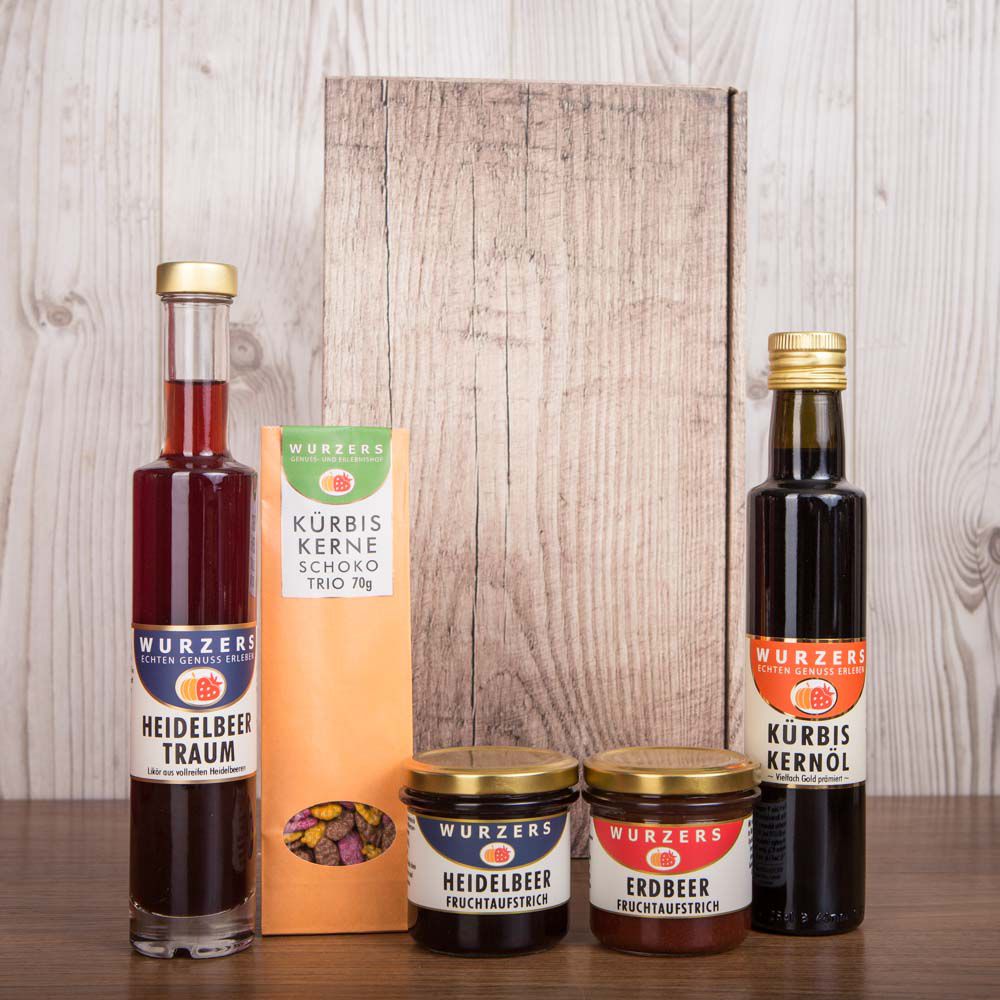 Das Geschenkpaket Potpourri vereint fünf besondere Spezialitäten von unserem Genuss- und Erlebnishof: von fruchtigen Marmeladen über nussiges Kürbiskernöl bis hin zum beliebten Heidelbeertraum-Likör. Eine genussvolle Mischung für alle, die Vielfalt lieben!
