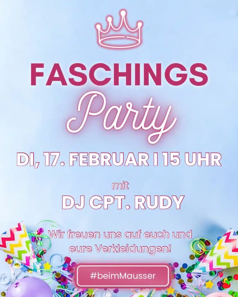 Familie Mausser freut sich auf zahlreiche Faschingsgäste: Der erstklassige Mostproduzent verwandelt sich für eine Nacht in eine erstklassige Faschings-Location! Alle sind eingeladen, in kreativen Verkleidungen zu kommen.. Eines ist sicher: Jede Menge Gaudi ist vorprogrammiert. Für beste Stimmung sorgt DJ Cpt. Rudy!