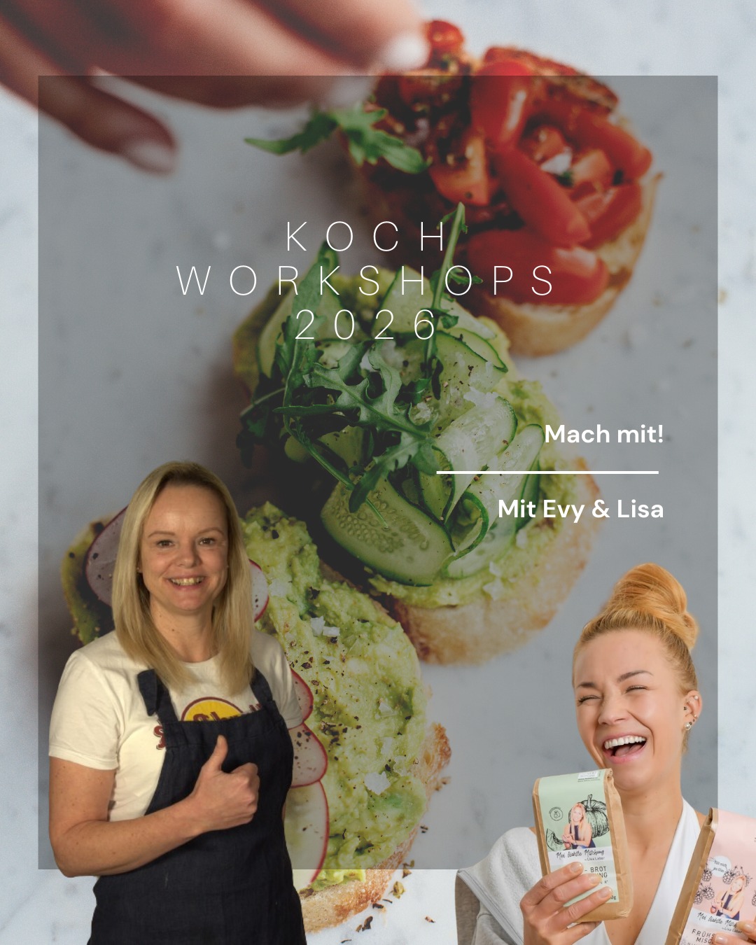 Bei den Kochworkshops mit Lisa & Evy dreht sich alles um saisonale Schwerpunkte und gesundes Kochen, das alltagstauglich ist und trotzdem richtig Spaß macht. Gemeinsam wird geschnippelt, gerührt, ausprobiert und verkostet – in entspannter Atmosphäre, mit vielen Tipps rund um Zutaten, Zubereitung und clevere Variationen. Im Mittelpunkt stehen gemeinschaftliches Kochen, Lernen und Genießen – ganz ohne Stress, aber mit viel Geschmack.