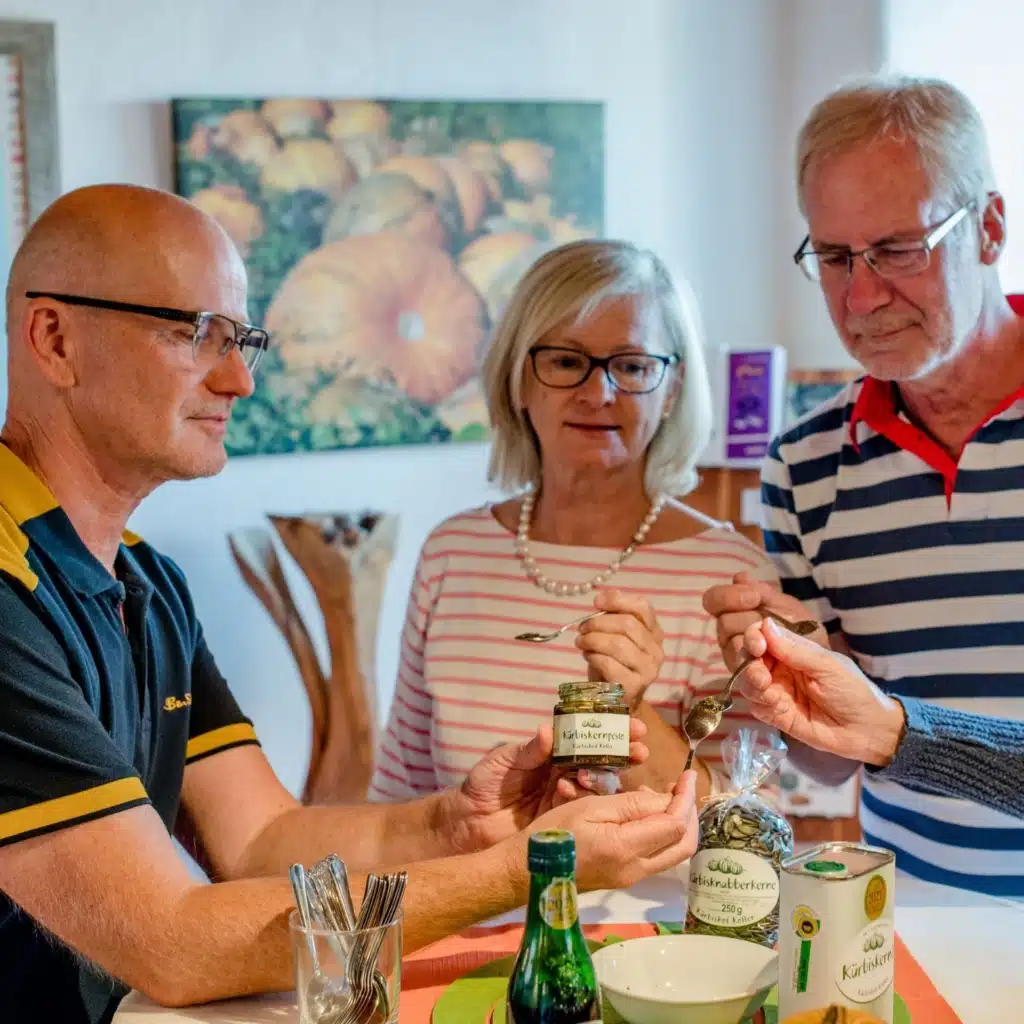 Ob in der Ölmühle, wo der Duft frisch gepresster Kürbiskerne in der Luft liegt, in einer Käserei, wo in liebevoller Handarbeit charaktervolle Käse entstehen, oder in der Essigmanufaktur mit hunderten Holzfässern – jeder Stopp erzählt seine eigene Geschichte. Besucher erfahren aus erster Hand, wie aus regionalen Rohstoffen preisgekrönte Spezialitäten werden, und dürfen diese natürlich auch verkosten. Manchmal wird gemeinsam gekocht, wie bei der Zubereitung frischer Kürbisnudeln, die anschließend in geselliger Runde genossen werden. Und zum Abschluss wartet eine typische steirische Jause, bei der regionale Spezialitäten und ein gutes Glas Wein den Tag abrunden.